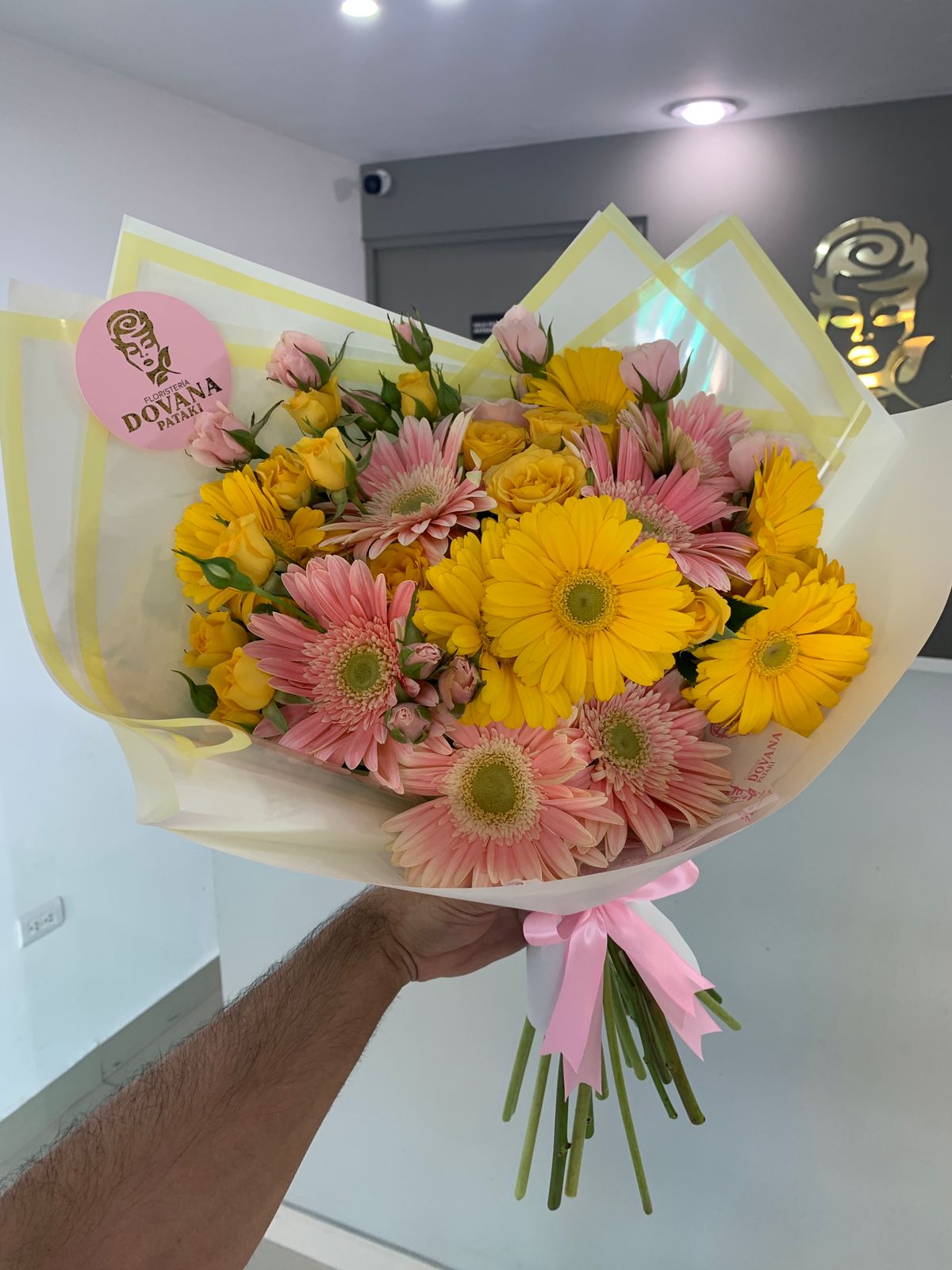 Ramo de gerberas de tamaño mediano, decorado con mini rosas.