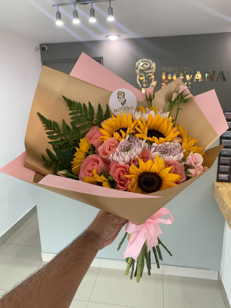 Ramo de tamaño mediano, elaborado con girasoles, rosas y decorado con mini rosas y follajes calidad Premium.