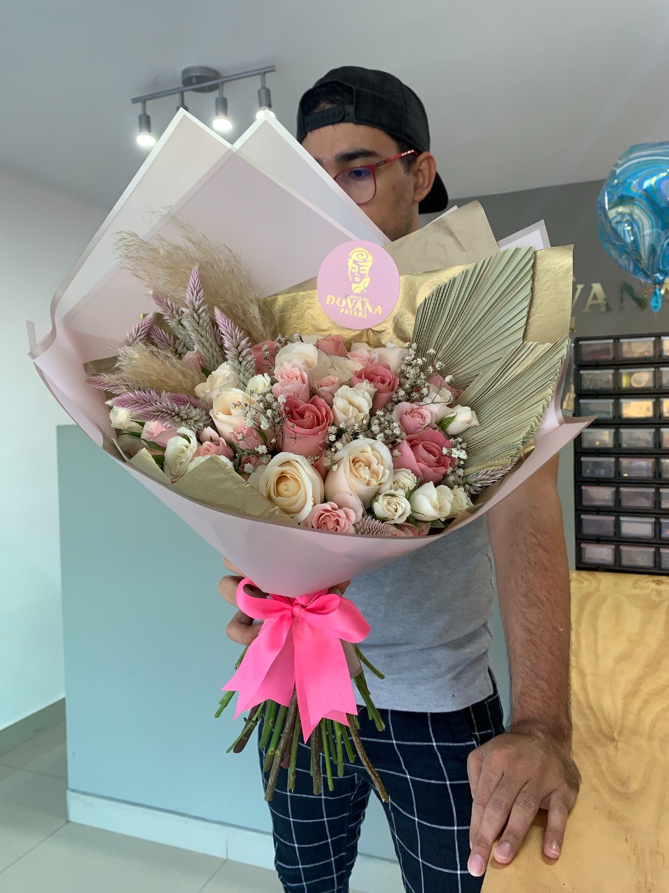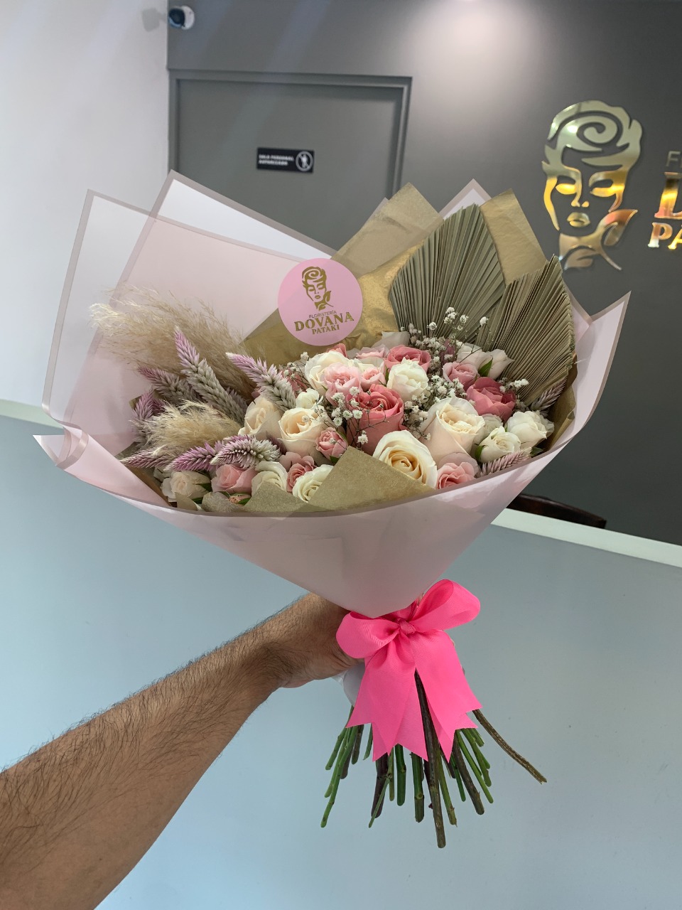Ramo de flores tamaño grande, elaborado con rosas, minirosas, pampa grass y hoja de palma.