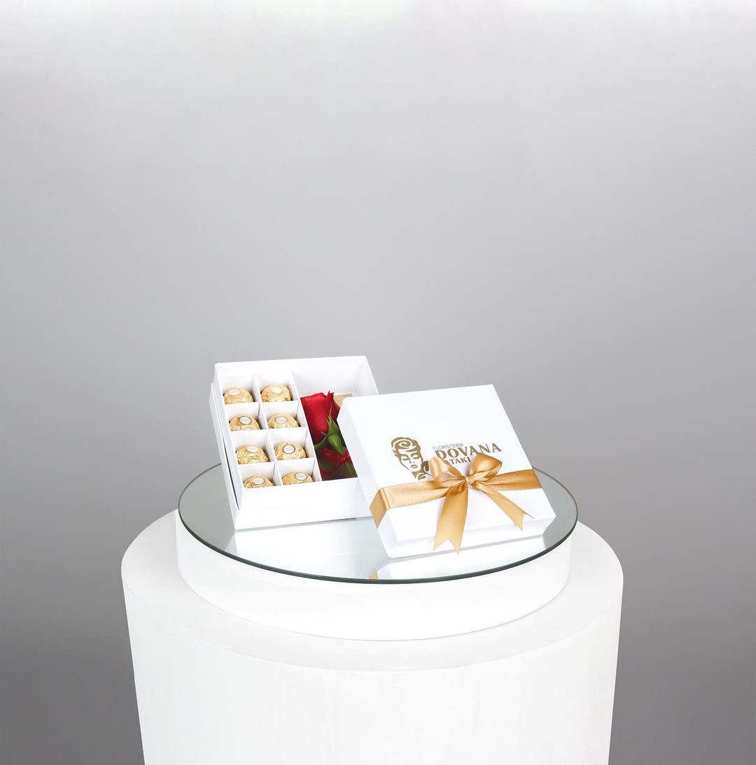 Caja de cartón rígido brilloso, en su interior puedes encontrar 8 piezas de Ferrero Rocher y una rosa. Medida aproximada 15 cm.