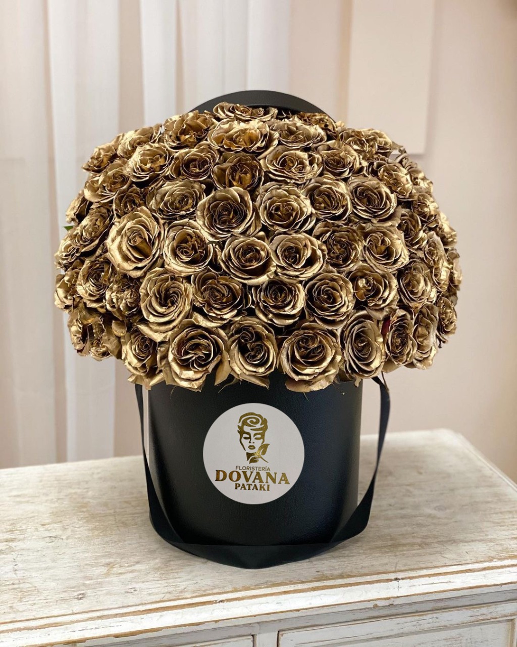 Arreglo floral en caja circular de papel rígido. Medidas aproximadas 35 cm de base x 50 cm de altura. Contiene 100 rosas calidad Premium, bañadas en color oro 24k.