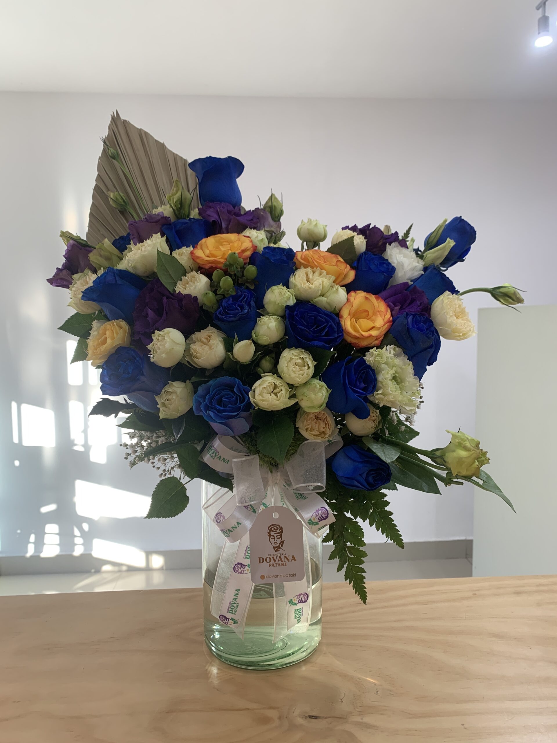 Arreglo floral elaborado sobre cilindro de cristal. Medidas 40 cm de ancho x 65 cm de altura. Elaborado con rosas, lisianthus, mini rosa y hoja de palma.