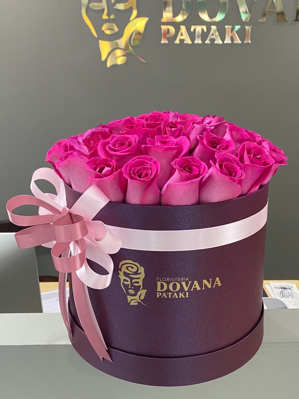 Arreglo floral en caja circular de papel rígido. Medidas de 35 cm de base x 25 cm de altura. Contiene aproximadamente 50 Rosas calidad Premium.