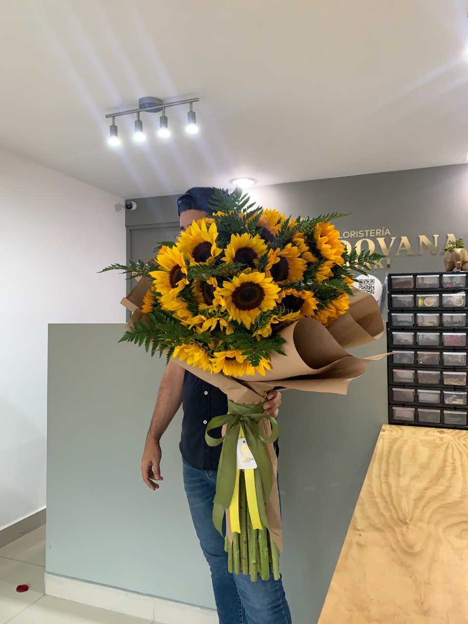 Ramo de tamaño grande elaborado con 30 girasoles de tallo grueso y decorado con follajes.