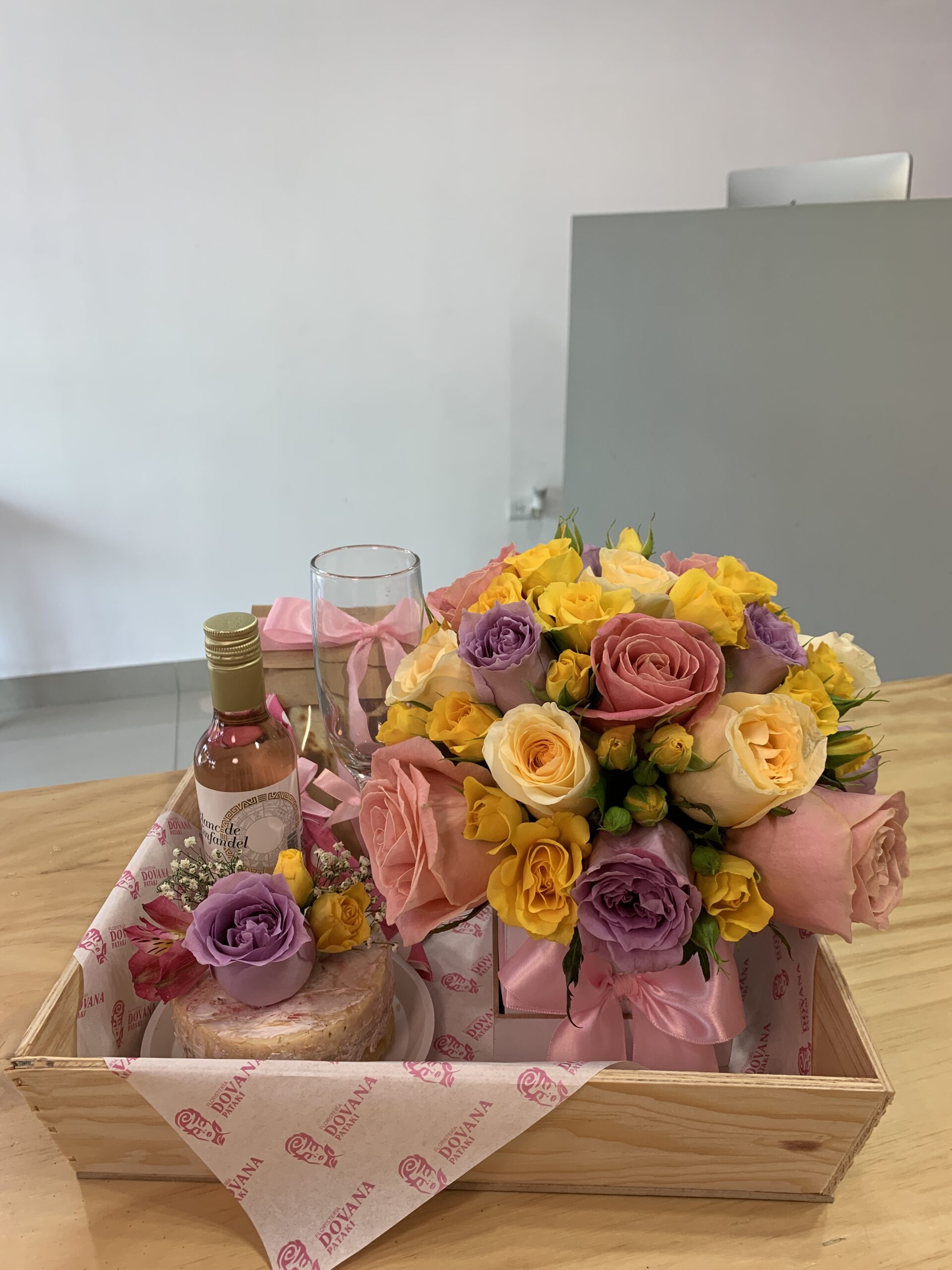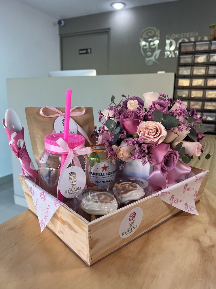 Charola de madera con medidas de 30×30 cm incluye:1 mini pastel, 1 sobre con galletitas, 1 bebida a elección, 1 copa o frasco a elegir, 1 mini arreglo de flores variadas.