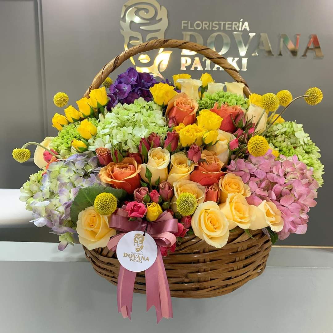 Canasta de mimbre, contiene hortensias adornadas con flores y follajes mixtos de calidad premium. Medidas aproximadas 40 cm de base x 45 cm de altura.